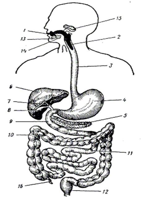 1 - рот, 2 - глотка, 3 - пищевод, 4 - желудок, 5 - поджелудочная железа, 6 - печень, 7- желчный проток, 8 - желчный пузырь, 9 - двенадцатиперстная кишка, 10 - толстая кишка, 11 - тонкий кишечник, 12 - прямая кишка, 13 - подъязычная слюнная железа, 14 - подчелюстная железа, 15 - околоушная слюнная железа, 16 - аппендикс