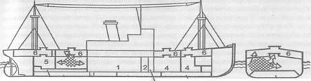1-машинное отделение; 2-бункер (для жидкого топлива); 3-коффердам; 4-трюм; 5-отсеки; 6-межпалубное пространство (твиндек); 7-туннель