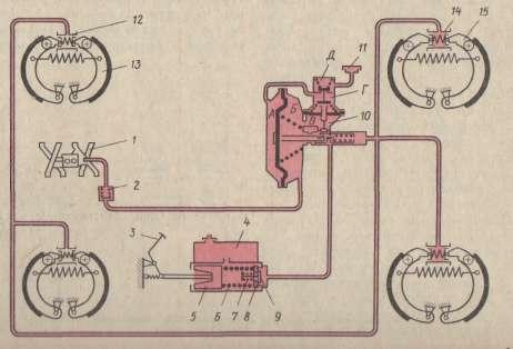 включает тормозные механизмы передних 13 и задних 15 колес, гидравлический тормозной привод, приводимый в действие педалью 3, и вакуумный усилитель 10, включенный в тормозной привод