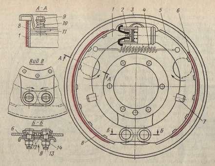 с равными приводными силами и односторонним расположением опор колодок. Опорный диск 3 закреплен на картере моста. В нижней части опорного диска установлены два пальца 13, на которых закреплены эксцентричные шайбы 12. Положение пальцев фиксируют гайками 14. На эксцентричные шайбы надеты нижние концы колодок 1 и 5. Стяжная пружина 4 прижимает каждую колодку к ее регулировочному эксцентрику 11. Регулировочные эксцентрики закреплены на опорном диске болтами 9, удерживаемыми от произвольного проворачивания предварительно сжатыми пружинами 10. Пружина фиксирует регулировочный эксцентрик в любом положении при повороте его за головку болтов. Таким образом, каждая колодка центрируется относительно тормозного барабана регулировочными эксцентриками и эксцентричными шайбами пальцев. Верхние концы колодок соприкасаются с поршнями цилиндра 2. От боковых смещений колодки удерживаются направляющими скобами 7 с пластинчатыми пружинами. Длина фрикционных накладок, прикрепленных к передним и задним колодкам, неодинакова. Передняя накладка 8 длиннее задней 6. Сделано это для обеспечения одинакового износа накладок, так как передняя колодка работает большее время как первичная и создает больший тормозной момент, чем задняя. Барабан тормоза прикреплен к ступице колеса. Для удобства доступа к колодкам барабан сделан съемным.Тормоз автомобиля