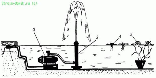 1 – водонепроницаемый соединитель; 2 – погружной насос; 3 – труба с форсункой; 4 – плавающие растения; 5 – кувшинки