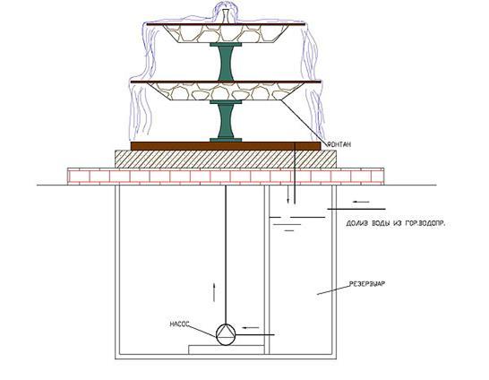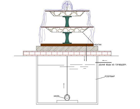 – с помощью насоса из водоема, в котором расположен фонтан, со сбросом воды в него же;