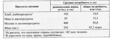 Для расчета такой потребности за базу был принят уровень потребления продовольствия, наиболее приближенный к развитым странам и соответствующий физиологическим потребностям человека. Этим условиям в наибольшей степени отвечают научно обоснованные нормы питания. Данные табл. 2показывают, что при прогнозируемой численности населения России 145 млн. человек общая годовая потребность страны в хлебных продуктах (в пересчете на крупу, муку и зернобобовые) составит 14,8 млн. т, в мясе и мясопродуктах - 12,3 млн. т, в