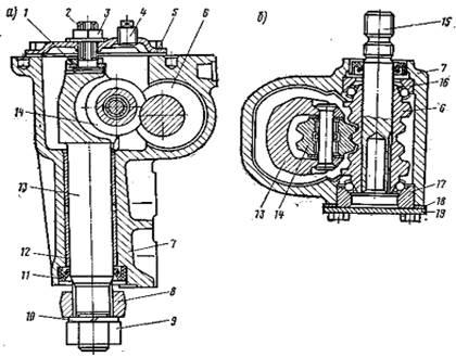 Картер рульового механізму (див. рисунок 2) 1 прикріплений до лівої подовжньої балки кузова з внутрішньої сторони відсіку двигуна трьома болта-м-и 2. Між картером і балкою кузови встановлюються регулювальні шайби 3, підбором яких домагаються співвісності вала черв'яка кермового механізму і вала рульового керування. В картері 7 кермового механізму мається черв'як 6, що входить у зачеплення з двухгребневим роликом 14 вала сошки. Передаточне число кермового механізму — 16,4. Черв'як напресований на вал 15 і обертається в двох кулькових підшипниках, причому внутрішніми обоймами підшипників є торцеві поверхні черв'яка, на яких маються кільцеві канавки. Осьовий зазор у підшипниках черв'яка регулюється підбором прокладок 18 між картером і кришкою 19 кермового механізму. Ці прокладки поставляються в запасні частини двох розмірів: товщиною 0,1 і 0,15 мм. Вал сошки обертається в двох бронзових втулках 12, запресованих у картер кермового механізму. У шлицевом отворі сошки маються дві здвоєні западини,