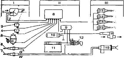 1- пристрій вхідних параметрів ( датчик температури всмоктуваного повітря); 2-витратомір повітря; 3 — вимикач положення дросельної заслінки; 4 — висотним коректор; 5— датчик-розподільник запалювання; 6 — датчик температури охолодної рідини; 7— термореле; // — пристрій керування й забезпечення (електронний блок керування); 9 — блок реле; 10 — паливний насос; 11 — акумуляторна батарея; 12-вимикач запалювання); /// — пристрій вихідних параметрів; ІЗ — робочі форсунки; 14 — клапан додаткового повітря; 15 — пускова форсунка.