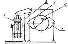 Рис. 2. Колодочный тормоз с электрогидравлическим толкателем: 1 - электрогидравлический толкатель; 2 – затормаживающая пружина; 3 – тормозные колодки; 4 – тормозной шкив.
