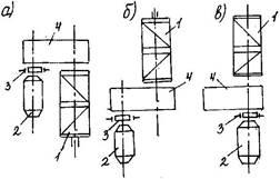 а – «П» - образная; б - "Z"-образная; в - соосная. 1 – барабан; 2 – электродвигатель; 3 – тормоз; 4 - редуктор.
