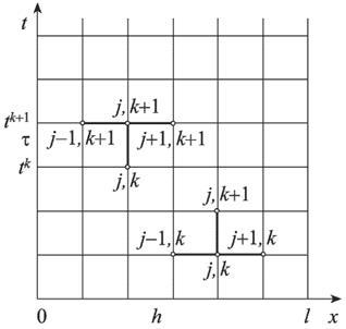 Рисунок 3 - Шаблон неявной конечно-разностной схемы для уравнения теплопроводности