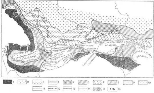 Схема строения Причерноморской и Азовско-Кубанской впадин (по М. В. Муратову, 1949): 1 — мегантиклинали Восточных и Южных Карпат, Балканского хребта, Горного Крыма и Большого Кавказа; 2 — Русская платформа с докембрийским фундаментом, не захваченная неогеновыми опусканиями; 3 — часть Русской платформы с докембрийским фундаментом, вовлечённой в опускания краевых впадин Альпийской области в тортоне и сармате: 4 — линия предполагаемого сочленения докембрийского и герцинского оснований внутри краевых впадин; 5 — участки выхода на поверхность герцинского фундамента; 6 — приподнятые участки герцинского основания; 7—более погруженные участки герцинского основания; 8 — Добруджинско-Станиславская палеозойская гряда, в настоящее время глубоко погруженная; 9 — краевые части впадин; 10 — нижнее миоценовая Прикарпатская впадина: 11 — край нижне миоценовой Прикарпатской впадины; 12— граница максимального распространения тортонских отложений; 13 — граница максимального распространения сарматских отложений; 14 — контур наиболее опущенных частей впадин: 15 — тортонско-нижне сарматские рифы: 16 — средне сарматские рифы