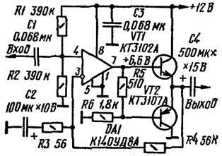 Конденсаторы С6…С9 корректируют фазовую и частотную характеристики каскада. Стабилитроны VD1, VD2 стабилизируют напряжение питания ОУ, которое одновременно используется для создания необходимого напряжения смещения выходного каскада.