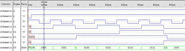 Мінімізація функцій входів тригерів забезпечує мінімум апаратних витрат на реалізацію комбінаційної частини лічильника. З часової діаграми роботи двійково-десяткового лічильника видно, що лічильник проходить всі стани які відповідно кодують цифри від 0 до 9 (згідно таблиці функціонування), що й було необхідно.