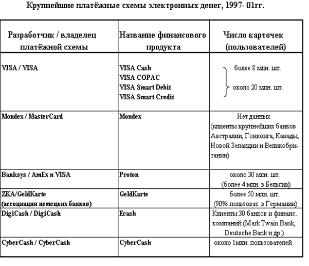 Из таблицы 3 мы видим, что наибольшее распространение среди платёжных систем на основе смарт-карт в настоящий момент имеют системы GeldKarte (около 60 млн. шт.) и Proton (около 30 млн. шт.), а среди систем “сетевых денег” система CyberCash (около 1 млн. пользователей).