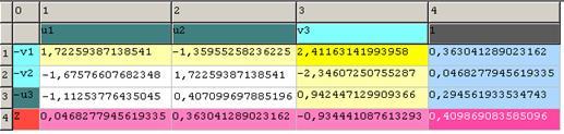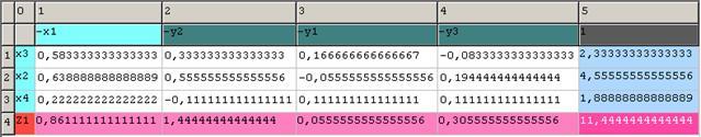 3) Матриця мір неоптимальності заміняється еквівалентною їй матрицею додаванням до кожної міри неоптимальності , тобто найбільшого з абсолютних значень всіх мір. Якщо таке найбільше значення рівне нулю, то всі міри рівні нулю, і в такому випадку замість нього до усіх мір додається число 1. В результаті отримуємо матрицю з невід’ємними елементами. На головній діагоналі усі вони рівні максимальному значенню. Така заміна матриці не змінює рішення гри, змінює тільки її ціна. Тобто тепер гра має вигляд не гри програшів, а гри з пошуком максимального виграшу. Для пошуку оптимальної стратегії для першого гравця гра подається як пара взаємнодвоїстих однокритеріальних задач ЛП. Для першого гравця потрібні значення змінних двоїстої задачі :