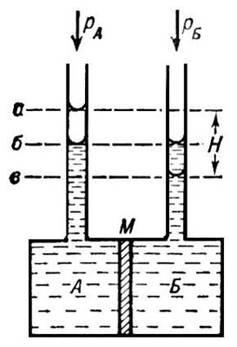 Принципиальная схема осмометра: А — камера для раствора; Б — камера для растворителя; М — мембрана. Уровни жидкости в трубках при осмотическом равновесии: а и б — в условиях равенства внешних давлений в камерах А и Б, когда rА = rБ, при этом Н — столб жидкости, уравновешивающий осмотическое давление; б — в условиях неравенства внешних давлений, когда rА — rБ = p.