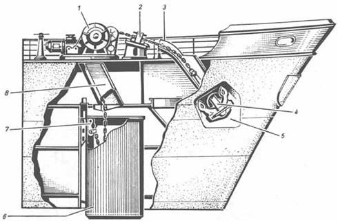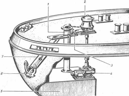 Рис. 4 - Кормовое якорное устройство. 1 - цепная труба; 2 - якорный шпиль; 3 - стопор для якорной цепи; 4 - двигатель; 5 - цепной ящик; 6 - якорь; 7 - труба якорного клюза