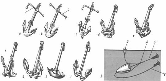 Рис. 8 - Типы якорей: а, b - шток-анкер; с - якорь Тротмана; d - якорь Холла; е - якорь Грузона; f - якорь Шпека; g - клипперский якорь со штоком и поворотными лапами (якорь Мартина); h - грибовидный «мертвый» якорь; i - дрек, кошка, верт; j - плавучий якорь; t - откидной шток; 2 - неподвижный шток; 3 - буй; 4 - шпрюйт; 5 - якорный трос; 6 – сорлинь