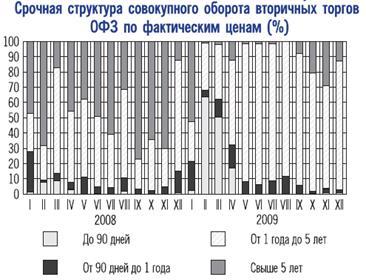 В течение 2009 г. активность участников вторичного рынка внутреннего облигационного долга существенно изменялась. В январе-марте она была самой низкой с июня 1999 года. С апреля наблюдалось постепенное оживление рыночных торговых операций, а с августа обороты вторичных торгов ОФЗ превышали докризисный уровень (рис.4).