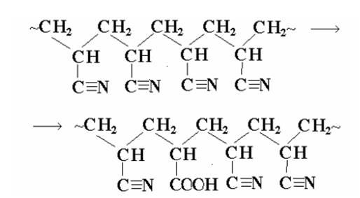 Например, частичный гидролиз нитрильных групп в макромолекулах ПАН приводит к появлению в цепи карбоксильных групп: