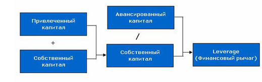 Финансовый рычаг (Leverage): соотношение заемного капитала и собственного капитала компании и влияние этого отношения на чистую прибыль. Чем выше доля заемного капитала, тем меньше чистая прибыль, за счет увеличения расходов на выплату процентов. Компания с высокой долей заемного капитала называется финансово зависимой компанией. Компания, финансирующая свою деятельность за счет только собственного капитала, называется финансово независимой компанией.