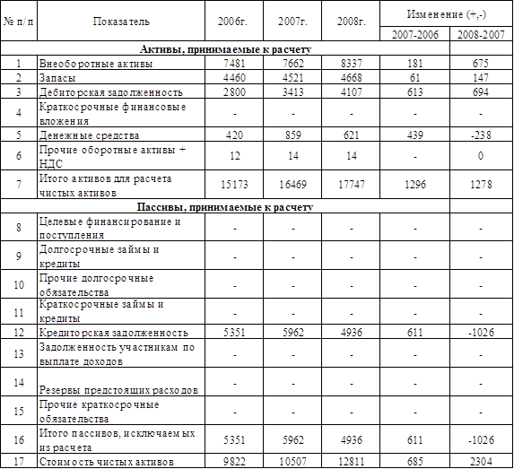 Общая стоимость внеоборотных активов возросла на 2,42 % в 2007 году по сравнению с 2006 годом, а в 2008 году – 8,81 %. Рост внеоборотных активов оценивается положительно, так как это говорит о развитии предприятия. Однако удельный вес внеоборотных активов в общей стоимости активов имеет тенденцию к снижению. Так в 2007 году их удельный вес сократился на 2,78 %, а в 2008 году незначительно вырос на 0,45 %.