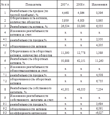 Факторный анализ проводился путем использования метода цепных подстановок (табл. 15). На основе произведенных расчетов были получены следующие результаты: общее изменение коэффициента оборачиваемости активов в 2008 году по сравнению с 2007 годом составило 0,86. При этом за счет увеличения объема реализации коэффициент оборачиваемости увеличился на 1,42, а увеличение стоимости активов привело к снижению оборачиваемости на 0,55.