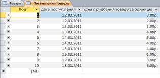 11. Відкриваю таблицю «Поступлення товарів» та заповнюю в ній 10 рядків за своїм бажанням.