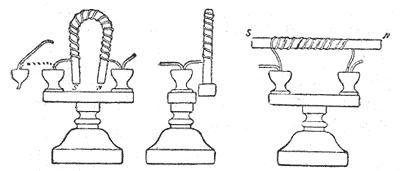 Первые магниты были сделаны «как бог на душу положит». Однако не любая форма давала хороший результат. Случайно получилось так, что Стерджен для своего первого магнита выбрал очень удачную – подковообразную – форму (подковообразные магниты изготовляют до сих пор). Отсутствие опыта и элементарной методики расчета магнитов привело к тому, что некоторые разновидности магнитов, предложенные в то время, были бы, на наш взгляд, просто абсурдными. Так, трехлапый магнит не мог бы успешно работать, так как магнитные потоки каждого стержня противодействовали бы друг другу – поток одного стержня замыкали на втором стержне, где он действовал навстречу потоку этого стержня.