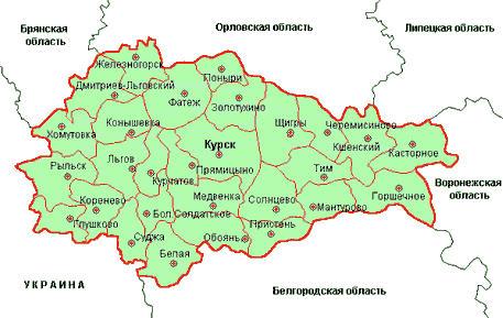 Протяженность области с севера на юг - 171 км, с востока на запад - 305 км, общая протяженность границ - 1250 км. Рис. 1. Карта Курской области.