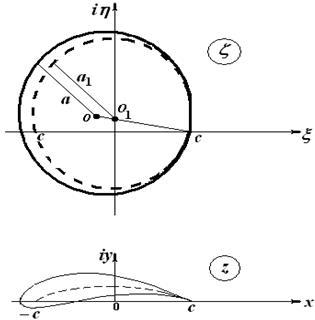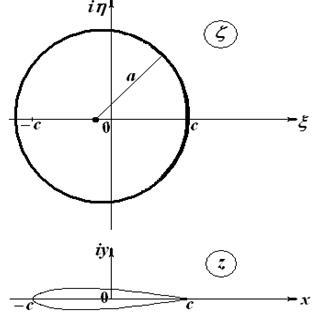 Жуковский первый рассмотрел применение конформного отображения в теории профиля. Он предложил простую функцию преобразования внешности круга во вспомогательной плоскости на внешность замкнутого профиля в плоскости течения: