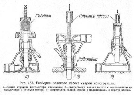 4) выпрессовать с помощью ручного пресса валик насоса вместе с подшипником из крыльчатки и корпуса, для чего необходимо опереть насос передним торцем корпуса на какое-либо основание с отверстием, обеспечивающим свободный проход через него подшипника, а нагрузку прикладывать к торцу валика насоса со стороны крыльчатки, как показано на рис. 151 б;
