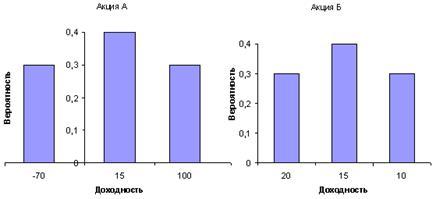 Разброс значений ожидаемой доходности по акции А почти в 20 раз больше, чем по акции Б. Очевидно, что первое вложение является более рискованным, поэтому предлагаемая по нему компенсация риска в виде 15% -ой доходности абсолютно недостаточна. Точно такую же среднюю ожидаемую доходность способна принести менее рискованная акция Б. Схема на рис.5.2 наглядно иллюстрирует разброс ожидаемых значений доходности по двум акциям: он значительно шире по первому активу (А). На этой схеме изображено распределение вероятностей. В данном случае оно является дискретным, прерывистым, поэтому данные представлены в форме столбцов (гистограмма). В случае непрерывного распределения, график представляет собой плавную кривую.