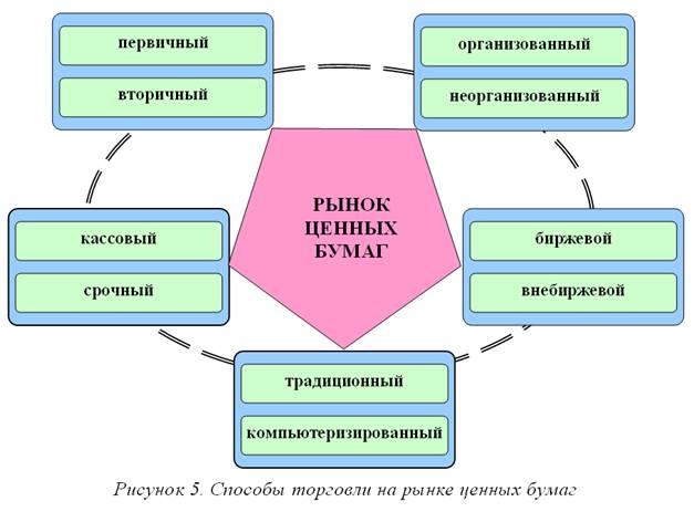 рынок ценных бумаг (РЦБ) - это рынок, на котором в качестве товаров выступают ценные бумаги. Главная функция РЦБ состоит в мобилизации финансовых ресурсов общества для целей организации и расширения масштабов хозяйственной деятельности. В структуре РЦБ выделяют денежный рынок и рынок капитала, первичный и вторичный рынки. В свою очередь, вторичный рынок подразделяется на биржевой и внебиржевой сегменты. По характеру эмитентов РЦБ делится на рынки государственных и негосударственных ценных бумаг. Рынок государственных ценных бумаг играет важное значение для регулирования экономической конъюнктуры в стране;