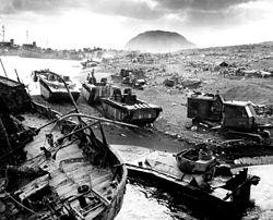 Кінець операції. Пошкоджена техніка військ США на березі Іодзіми. на передньому плані видніється загиблий десантник.