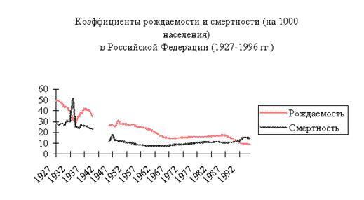 С начала 90-х г. демографическое развитие РФ вступило в период острейшего кризиса, охватившего все основные демографические процессы: смертность, рождаемость и миграцию. Современная демографическая обстановка сложилась на фоне длительных неблагоприятных тенденций демографического развития более чем тридцатилетнего периода, начиная с 60-х г. В то же время эволюционные тенденции постоянного ухудшения демографических процессов оказались резко усиленны негативным воздействием на население социально-экономического кризиса в стране, падением уровня жизни значительной части населения.