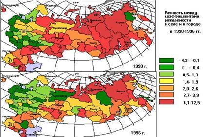 Наиболее информативным показателем, характеризующим состояние и перспективы воспроизводства населения территории, является коэффициент естественного прироста, который рассчитывается как разность между общим показателем рождения и общим показателем смертности и не зависит от направления и интенсивного миграционного обмена данной территории с ее окружением. Коэффициент естественного прироста в селе и в городе представлен на картосхеме. Положительность коэффициента естественного прироста означает, что население рассматриваемой территории увеличивается, а отрицательность - что население территории уменьшается. Рассмотрение эволюции этого показателя приводит к неутешительным выводам - если в 1990 г. только для 22 из 89 административных территорий России коэффициент естественного прироста был отрицательным, то в 1996 г. он был отрицательным уже для 72 территорий. На картограммах показано распределение коэффициента естественного прироста по территориям России в 1990 и в 1996 гг.