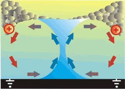 3)Конденсационная воронка, состоит из водяных капель и простирается вниз от подошвы грозовой тучи, если столб касается земли, - это торнадо, в противном случае,- это воронкообразное облако. Пыль и обломки, скапливающиеся в нижней части столба, указывают на формирование торнадо.