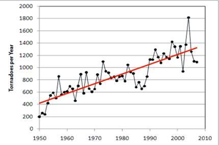 На следующем рисунке показан график ежегодного изменения числа торнадо в США с прямолинейным трендом, демонстрирующим общий характер ежегодного увеличения числа торнадо с 1950 по 2007 годы.