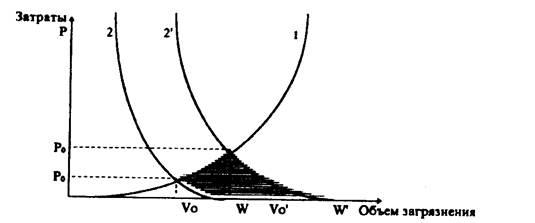 влево экономически не оправдано, т.к. в этом случае на предотвращение ущерба необходимо потратить больше средств, чем величина снижения ущерба. Экономия на природоохранных затратах (движение вправо от точки Vo