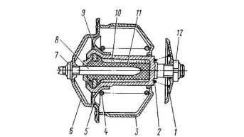 Передняя крышка 1 блока и корпус 2 подшипника соединены винтами и образуют полость, в которой установлена гидромуфта. Ведущий вал 6 в сборе с кожухом 3, ведущее колесо 10, вал 12 и шкив 11, соединенные болтами, составляют ведущую часть гидромуфты, которая вращается в шариковых подшипниках 8, 19. Ведущая часть гидромуфты приводится во вращение от коленчатого вала через шлицевой вал 7. Ведомое колесо 9 в сборе с валом 16, на котором закреплена ступица 15 вентилятора, составляет ведомую часть гидромуфты, вращающуюся в шарикоподшипниках 4, 13. Гидромуфта уплотнена резиновыми манжетами 17, 20. На внутренних тороидальных поверхностях ведущего и ведомого колес отлиты радиальные лопатки. На ведущем колесе тридцать три лопатки, на ведомом — тридцать две. Межлопаточное пространство колес образует рабочую полость гидромуфты.