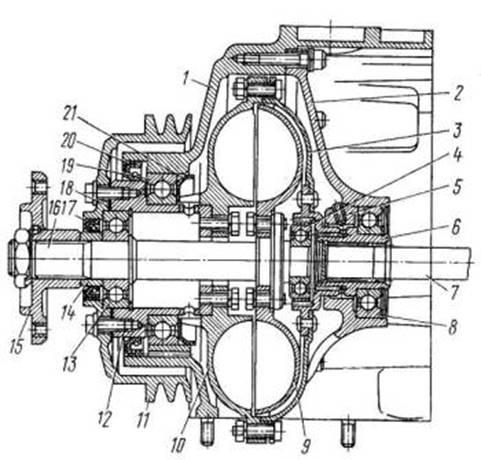 - крышка передняя; 2 - корпус подшипника; 3 - кожух; 4, 8, 13, 19 -подшипники шариковые; 5 - трубка корпуса подшипника; 6 - вал ведущий; 7 - вал привода гидромуфты; 9 - колесо ведомое; 10 - колесо ведущее; 11 - шкив: 12 - вал шкива; 14 - втулка упорная; 15 - ступица вентилятора; 16 - вал ведомый; 17, 20 - манжета с пружинами; 18 - прокладка; 21 – маслоотражатель
