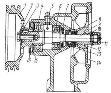 - шкив; 2 - болт; 3, 10 - шайбы; 4, 6 - подшипники; 5 - пресс-масленка; 7 - манжета; 8 -кольцо уплотнительное с обоймой; 9 - валик; 11- гайка колпачковая; 12 - кольцо упорное; 13 - уплотнение (сальник); 14 - крыльчатка; 15 - кольцо стопорное; 16 -пылеотражатель