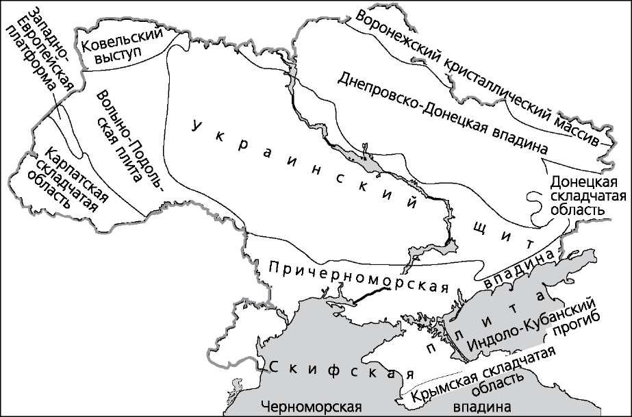Тектоническое строение Украины INCLUDEPICTURE "media/image8.jpeg" \* MERGEFORMAT  В основе большей части территории Украины лежит Восточно-Европей- ская платформа. На юге к ней примыкает молодая платформа — Скифская плита. Крайний юг и запад представлены альпийской складчатостью. Восточно-Европейская платформа — одна из древнейших на Земле, ее формирование закончилось около 2 млрд лет назад. На протяжении после- дующего времени ее фундамент то опускался, то поднимался, испытывая разломы, вдоль которых отдельные участки смешались относительно друг друга. Таким образом, здесь выделился Украинский щит — участок, где осадочный чехол минимальный и древние кристаллические породы выходят на поверхность. Щит протянулся от Ривненской и Житомирской областей до побережья Азовского моря. Его протяженность — 1100 км, ширина от 100 до 250 км. К западу от щита находится Волыно-Подольская плита с мощностью осадочного чехла 2000—2500 м. На левобережье Днепра, вдоль реки, протя- нулась Днепровско-Донецкая впадина с глубоко погруженным фундаментом и осадочным чехлом мощностью 4000—6000 м. Приморская часть Украины и Северный Крым лежат на молодой Скиф- ской платформе. Фундамент плиты ровный, перекрыт осадочным чехлом мощностью от 500—1000 м на юге до 3000—6000 м на севере. Особое место в тектонической структуре Украины занимает область альпийской складчатости. Перед складчатыми областями сформировались предгорные прогибы с мощным осадочным чехлом. Складчатые области про- должают формироваться и в настоящее время, о чем свидетельствуют перио- дически происходящие землетрясения. Существует связь между тектоническими структурами и крупными формами рельефа. Так, Украинскому щиту соответствуют Приднепровская 12