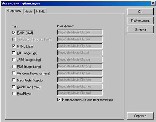 (Публиковать) создает файл Flash Player (SWF) и документ HTML, который поддерживает файл Flash Player в окне браузера. Команда Export Movie