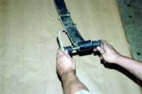 Разбираем рессору в тисках, зажав ее как можно ближе к центральному болту. Пометьте направление листов рессор, для облегчения сборки. Распрямляем концы хомутов и снимаем их.