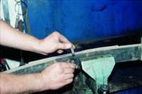 Вставив монтажную лопатку между болтами и оперевшись через прокладку о лонжерон, вытягиваем палец.