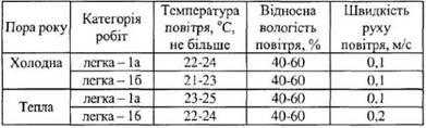 У виробничих приміщеннях на робочих місця із ПК мають забезпечуватись оптимальні значення параметрів мікроклімату: температури, відносної вологості й рухливості повітря (ГОСТ 12.1.005–88, СН 4088–86) (табл. 1).
