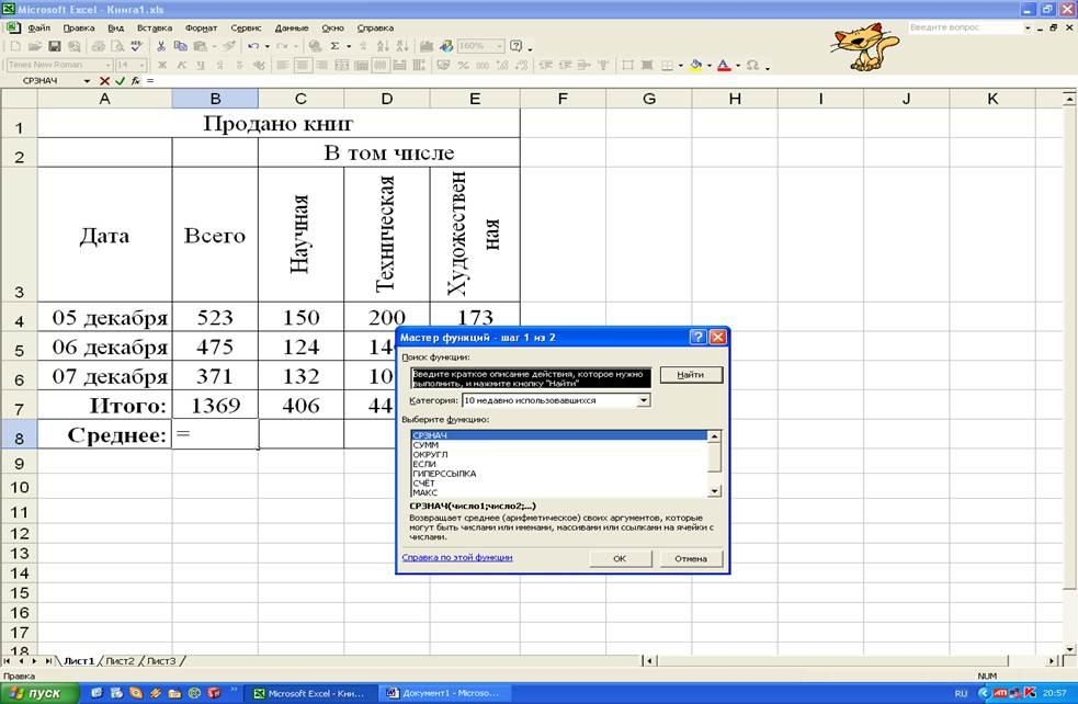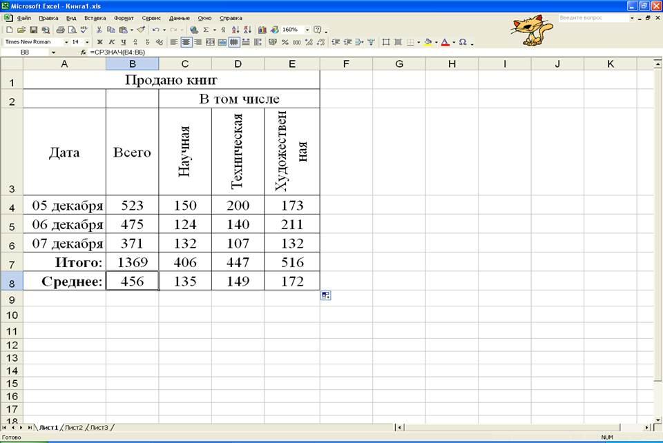 рассчитать суммарные значения по столбцам, в строке Среднее