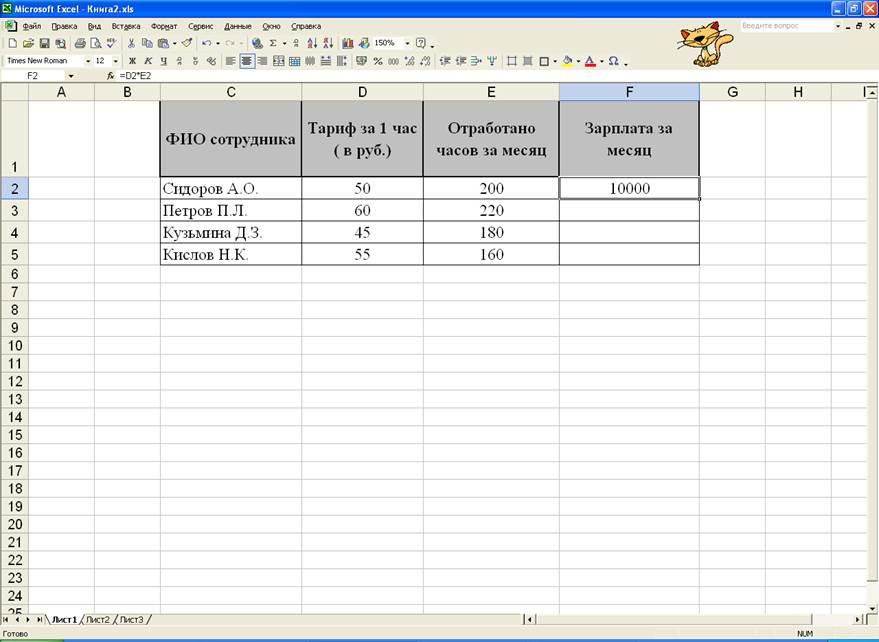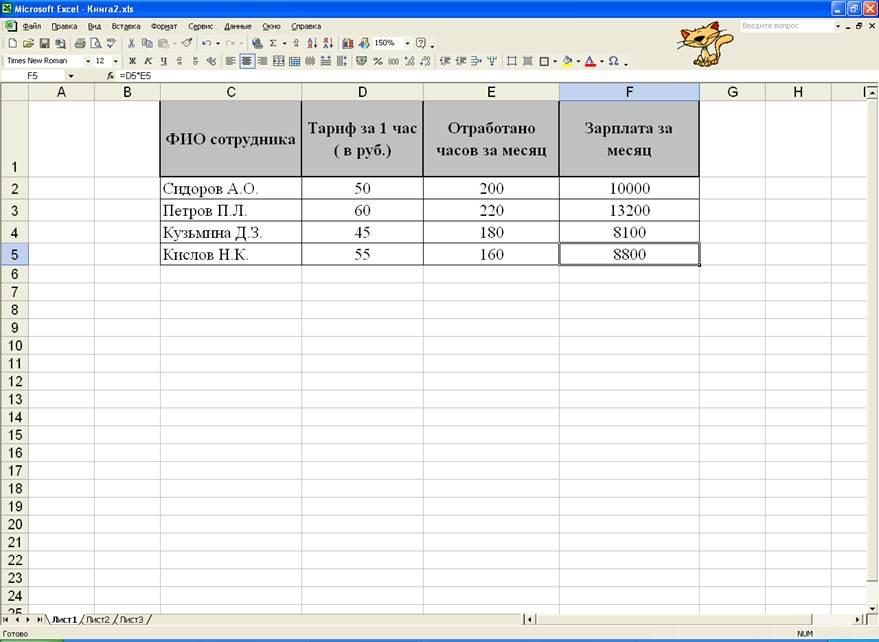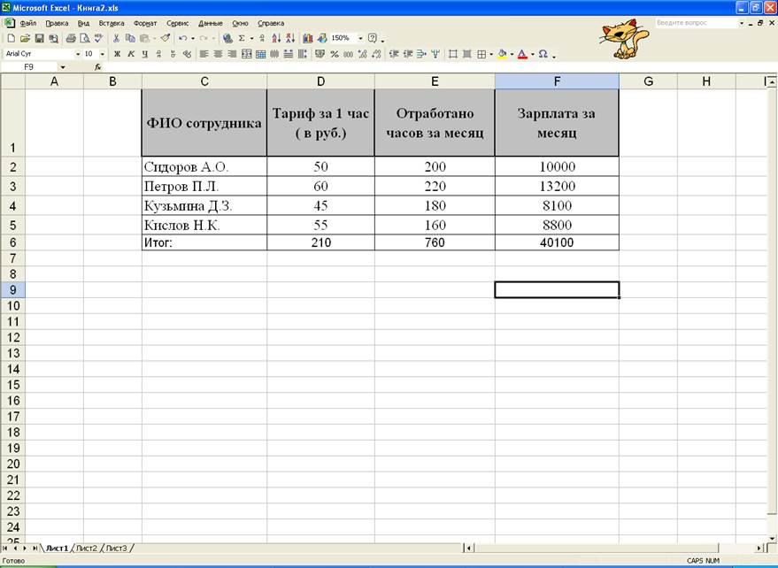 В программе Excel в ячейках С1:F5 набрать следующую таблицу, причем зарплату за месяц вычислить, используя соответствующие формулы, а затем подвести итоги по столбцам.