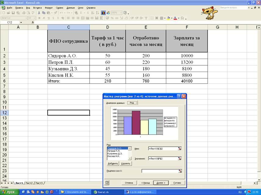Построить диаграмму «ФИО» - «Зарплата за месяц». Скопировать таблицу на другой лист и отсортировать список по убыванию суммы зарплаты.