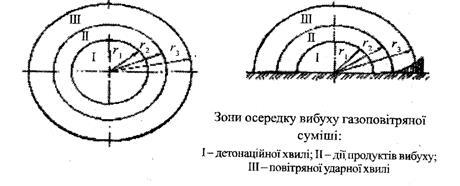 Під час вибуху газоповітряної суміші на ОГД утворюється осередок ураження з ударною хвилею, що спричиняє руйнування будівель, споруд та устаткування. Найбільш вибухо та пожежонебезпечними є суміші повітря з вуглеводневим газом. Вибух або спалах цих газів настає при їх певному вмісті у повітрі. В осередку вибуху газоповітряної суміші відокремлюють три коцентричні зони – детонаційної УХ, дії продуктів вибуху, повітряної УХ (див рисунок 3)